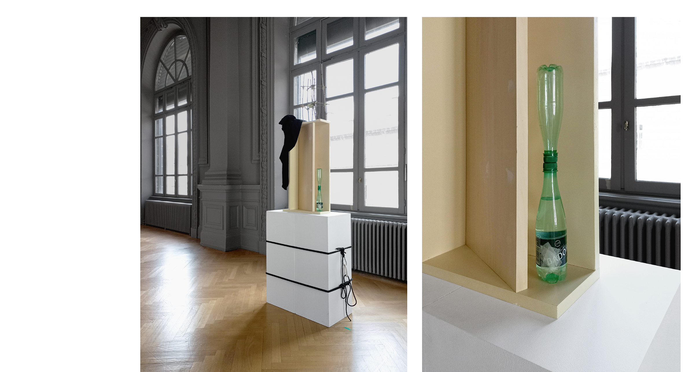 Materiaux : Socles d’exposition, Corde escalade, Mousqueton, Bouteilles d’eau,