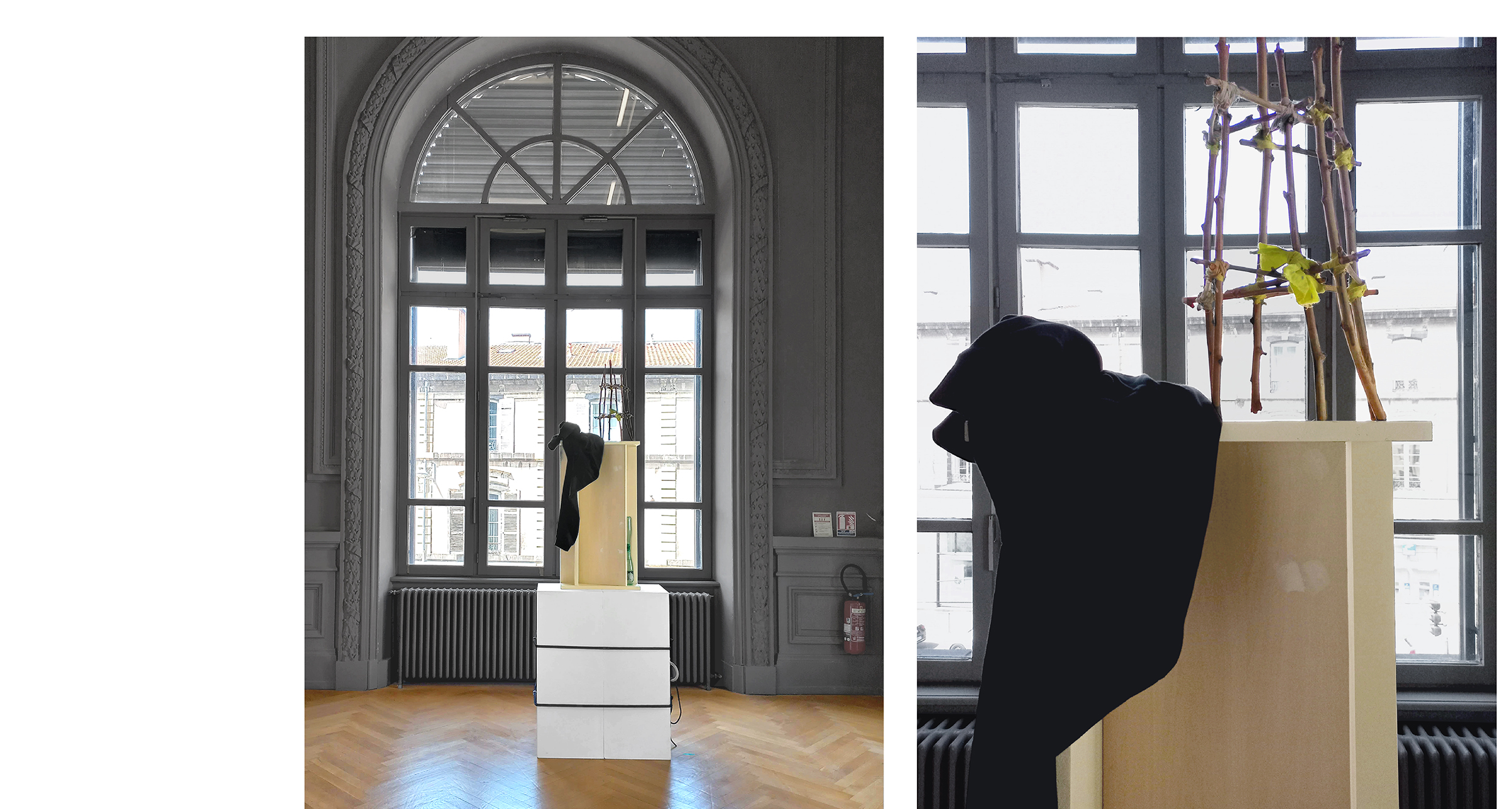 Materiaux : Socles d’exposition, Corde escalade, Mousqueton, Bouteilles d’eau,