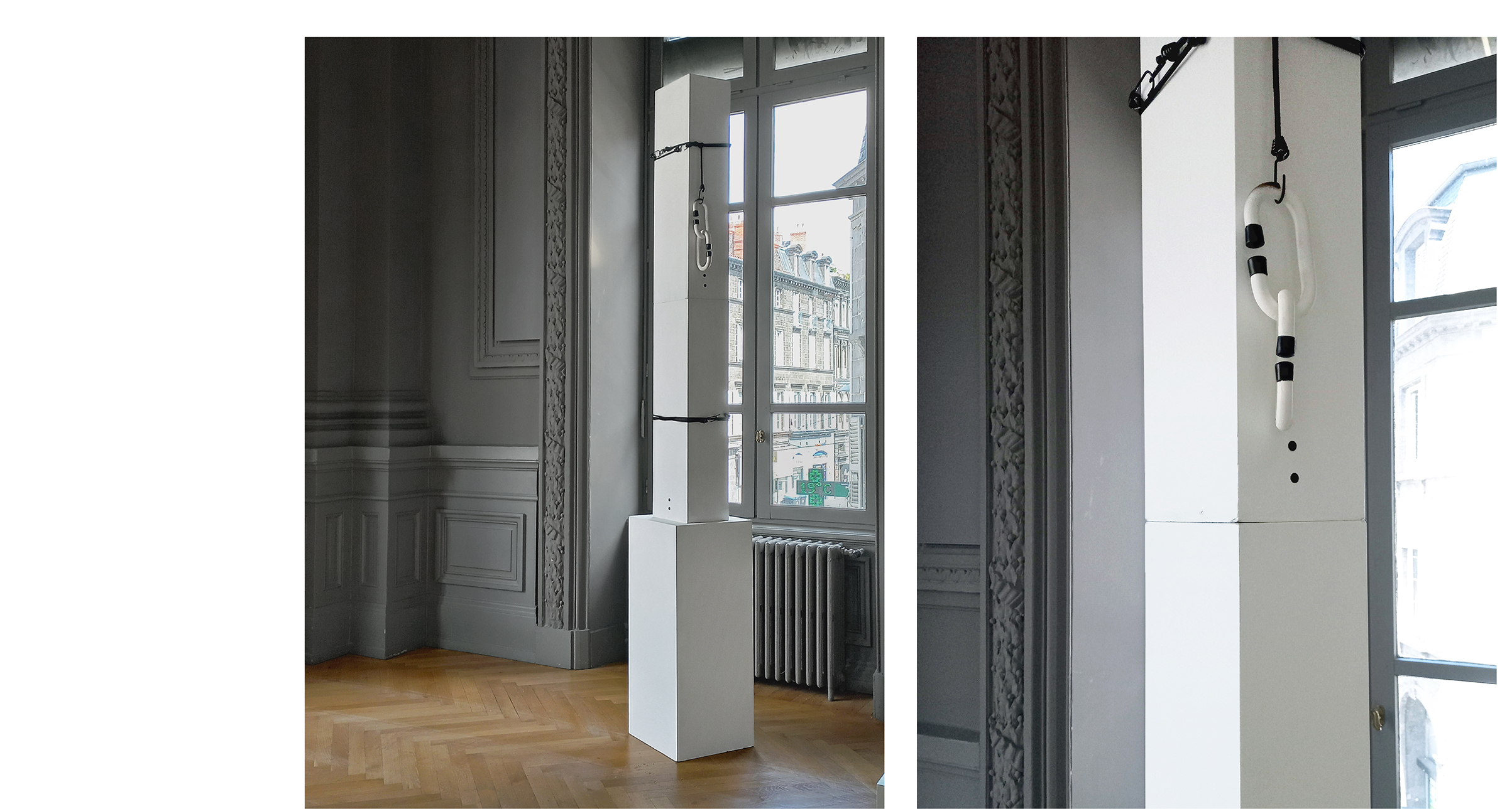 Materiaux : Socles d’exposition, Tendeurs, Mousqueton, Terre cuite, Caches vis Pvc.//
